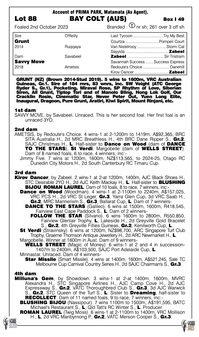 Un-named (Grunt – Savvy Move) 2 Year Old Bay Colt ProfilePedigreeEnquire Sire: Grunt Colour: Bay Dam: Savvy Move Sex: Colt Age: 2 Foaled: Oct 02, 2023 Country: Australia Silks: Incentives: First Name (required) Last Name (required) Your Email (required) Phone Message Hello, I'd like to know more regarding the horse Un-named (Grunt - Savvy Move) you have listed as available. Send Δ